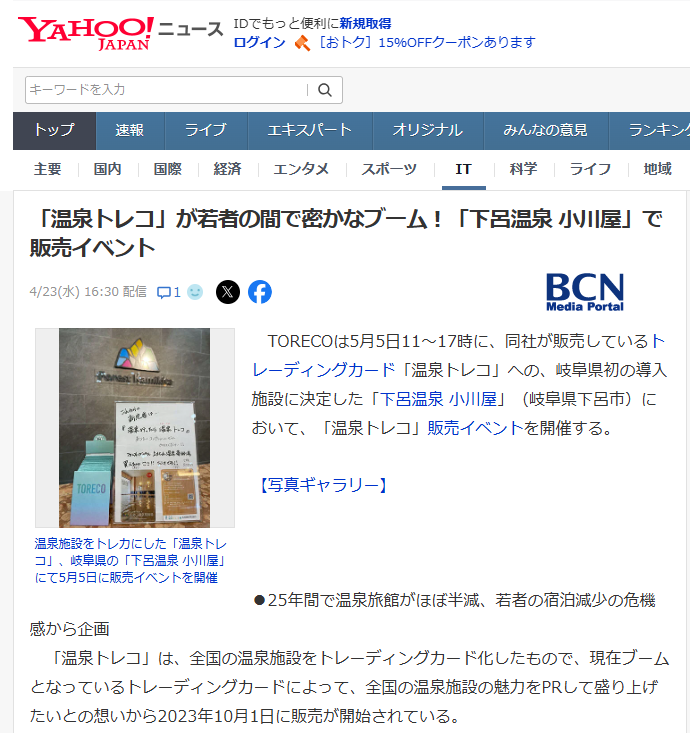 温泉トレコがYahoo!ニュースで紹介されました!