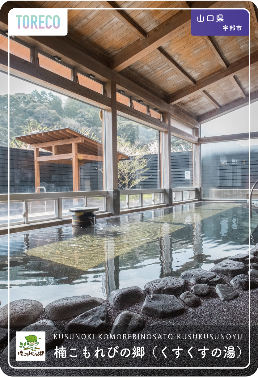 おすすめポイント楠こもれびの郷は温泉、パン屋、農家レストラン、直売所の複合施設。くすくすの湯は34.6℃の源泉を加温してかけ流している天然温泉です。四季折々の移り変わりを直に楽しむことができます。建屋は山口県産の素材をふんだんに使用しており、木の香りをお楽しみください。