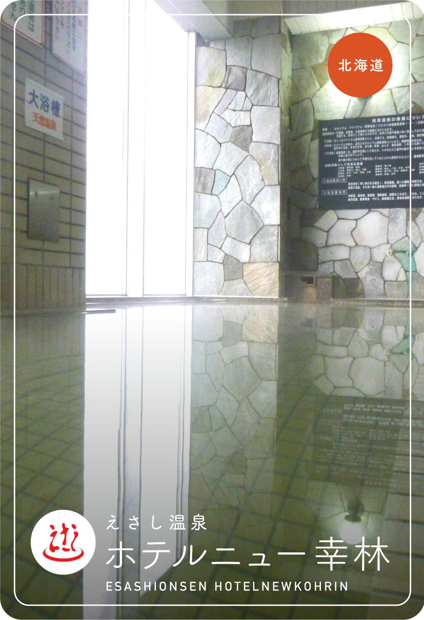 北海道枝幸郡枝幸町のえさし温泉 ホテルニュー幸林は、1984年に開湯。光明石温泉は、湯冷めしづらく、お肌によくなじみます。