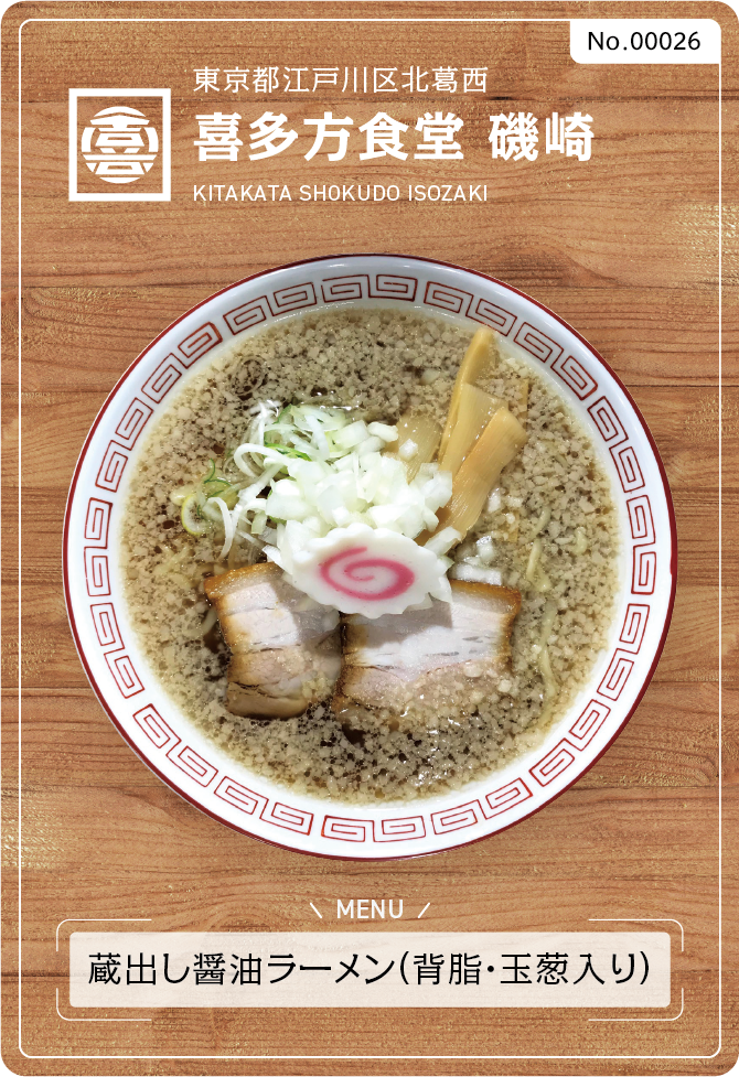 | メニュー・料金 | 蔵出し醤油ラーメン(背脂・玉葱入り)【850円】 |
