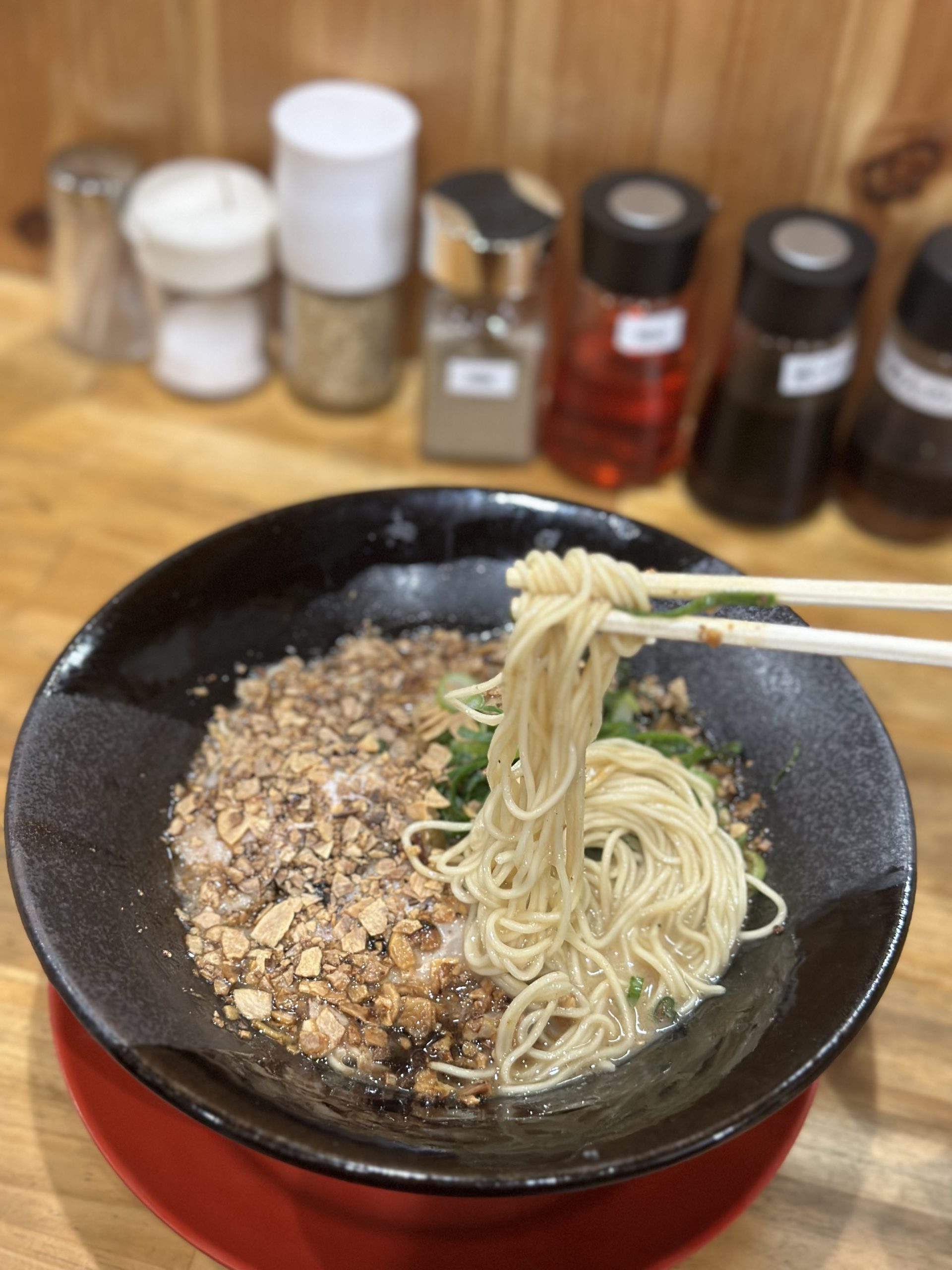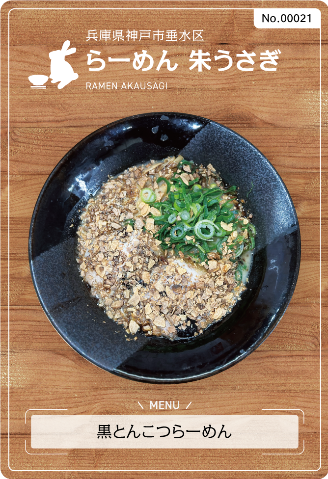 兵庫県神戸市垂水区のらーめん 朱うさぎは2種類の焦がしニンニクが一面を覆う一杯【ローストチップ&マー油】丁寧に時間をかけて仕込んだとんこつスープをニンニク色に染め上げる鬼畜の所業。が、ニンニクはローストしてあるので分量の割に食べやすく甘みすら感じると噂。