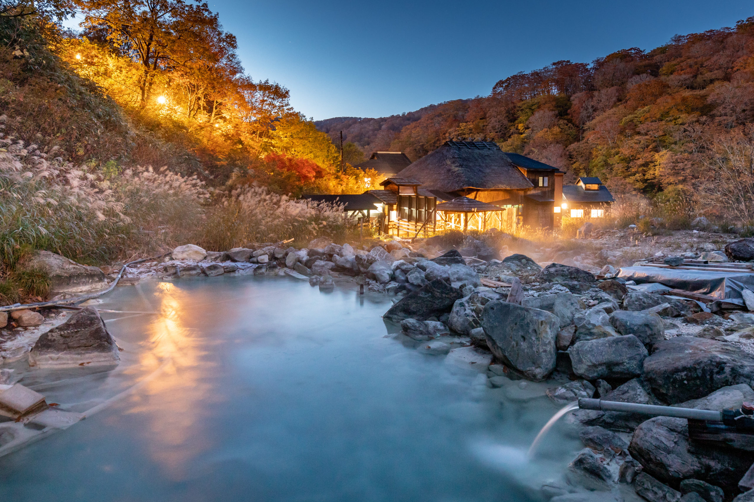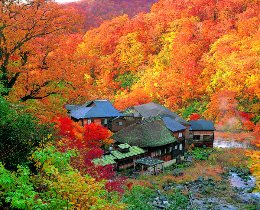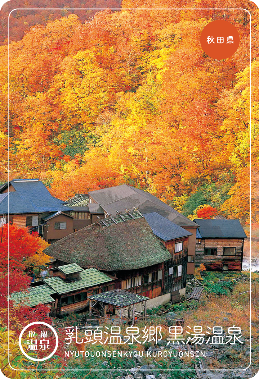 秋田県仙北市の乳頭温泉郷 黒湯温泉。渓流のせせらぎが静かにこだまする中、数軒の茅葺き、杉皮葺きの黒い宿舎や湯小屋が寄り添うように軒を連ね昔ながらの湯治場の風情を今に伝えています。