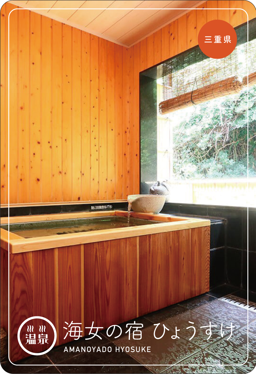 三重県鳥羽市の海女の宿 ひょうすけでは、海景色を望む陶器風呂、やさしい緑の光に包まれた檜風呂と、二種類の貸切風呂をお好みに応じて選べます。海を眺めながらの温泉は、最高に贅沢なひととき。貸切温泉で満喫してください!